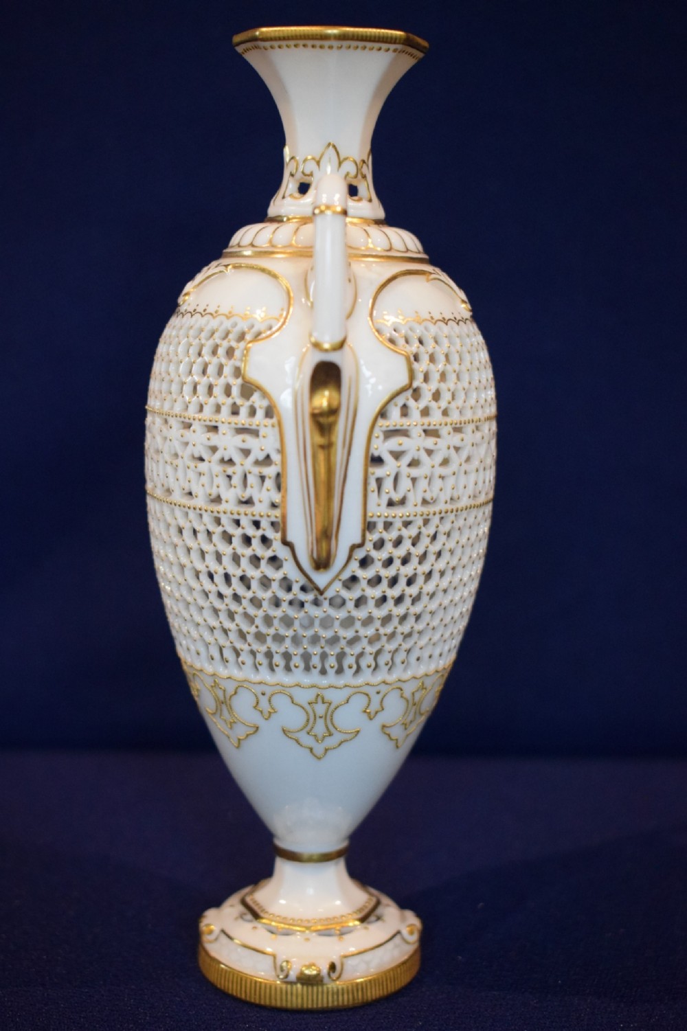 A good Royal Worcester reticulated vase by George Owen. The elegant shape finely reticulated in both graduated honeycomb and geometric piercing highlighted with flat and raised paste gilding. Excellent original condition, no damages or restoration. Fully Factory marked in gold with a date code for c1911. Inscribed signature G Owen.