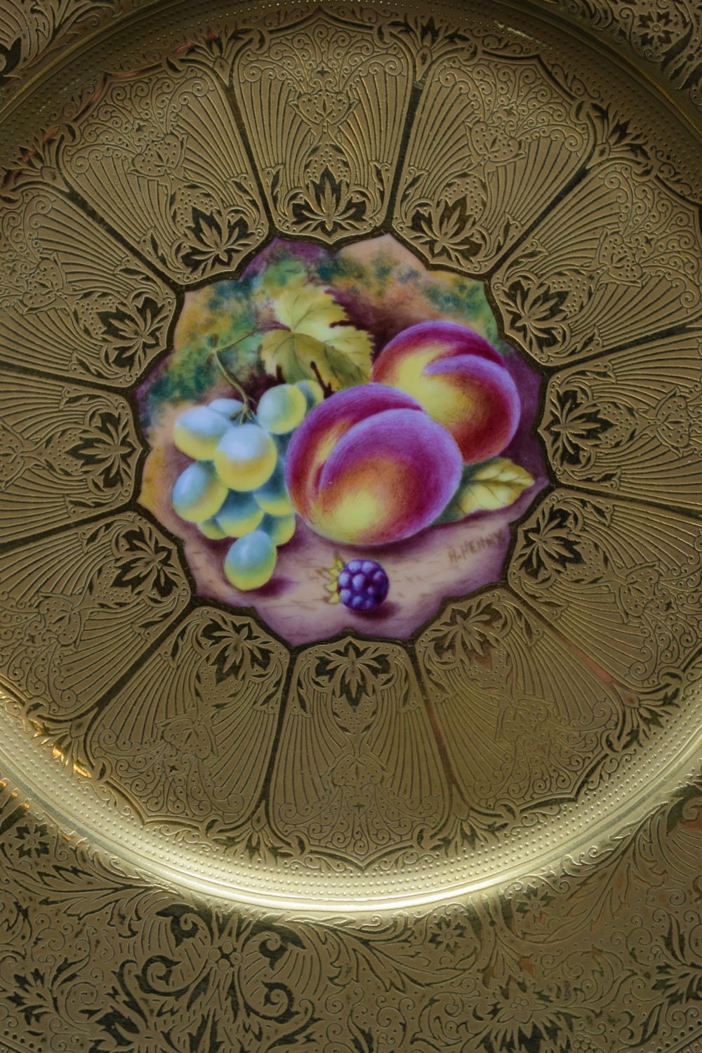 A fine Royal Worcester acid etched gilt plate wit a painted fruit centre by H Henry in excellent original condition. Large size, app.27.5cm., Factory marked, signed H Henry.