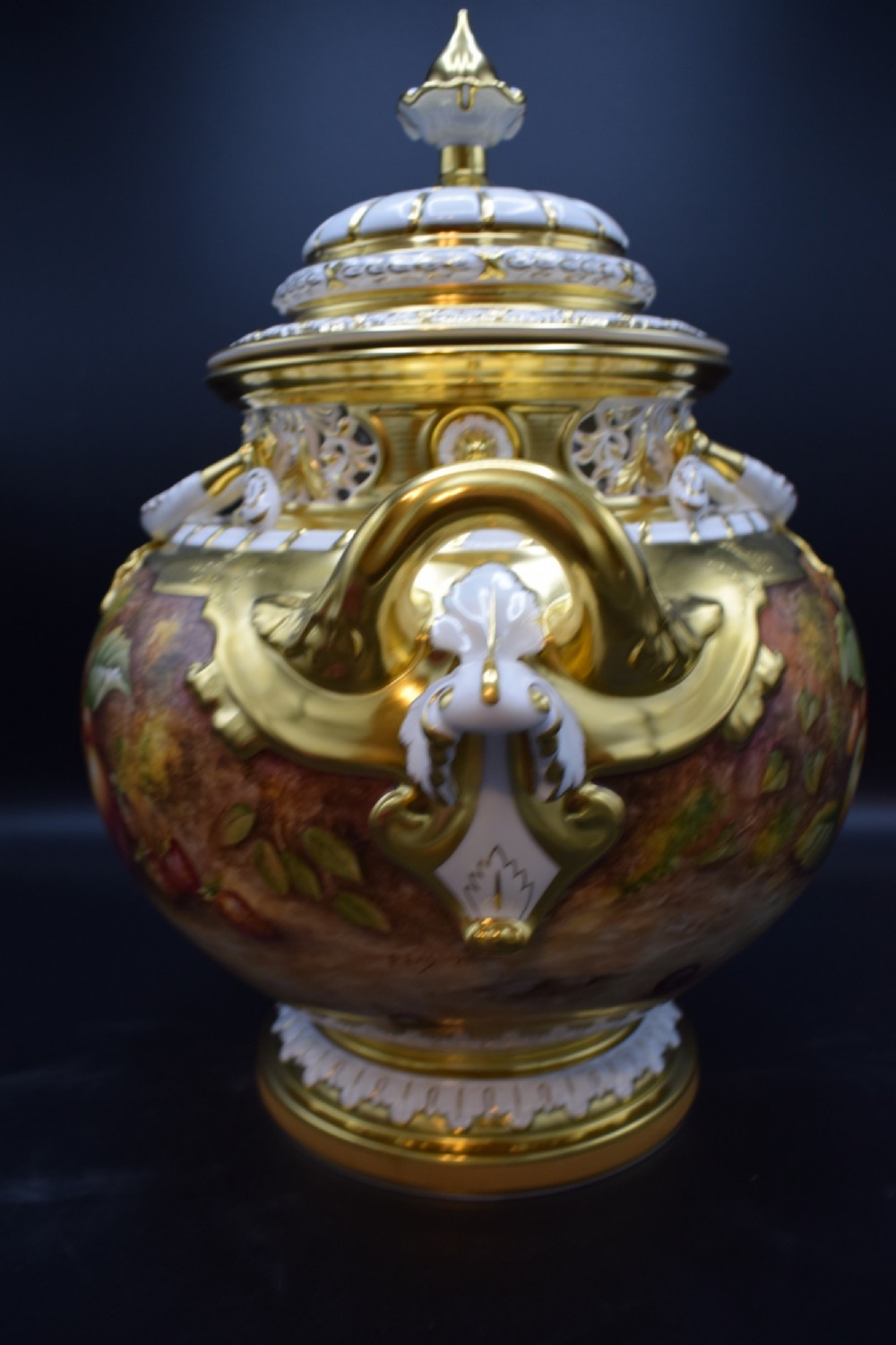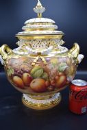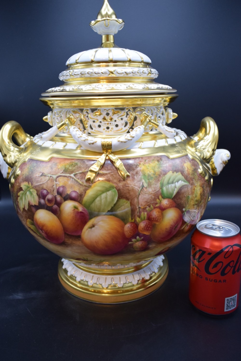 A very good Royal Worcester painted fruit Bow vase and cover, XL "Jumbo" size decorated all round by Paul English. Very difficult to find today with long lead times from the Factory. Todays list price is £20555, this one available now from stock and with a massive saving on list price. Boxed and in new condition, app. 16" (41cm) tall, signed P English.