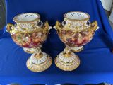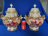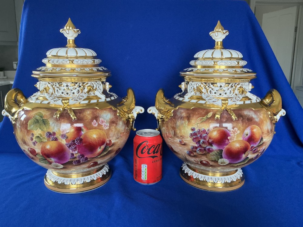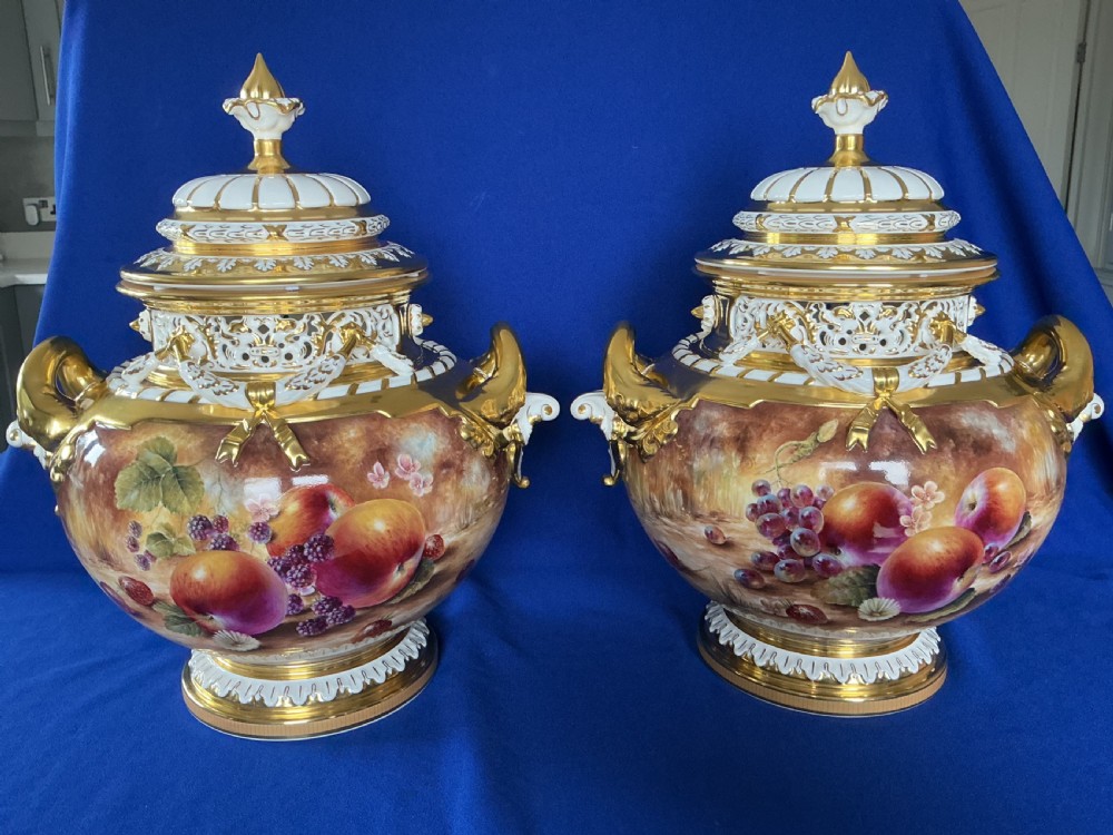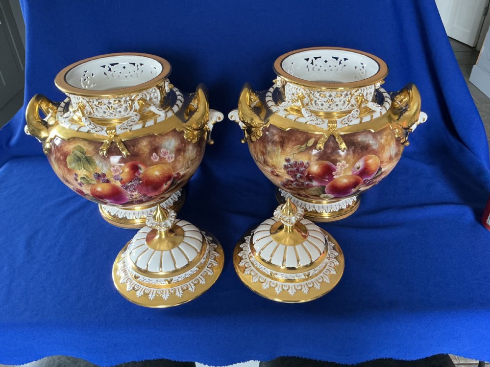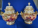 A fine pair of Royal Worcester painted fruit Bow vases and covers decorated all round by Sally Wood. Supplied in their original boxes, perfect condition, app. 14” (35.5cm) tall, signed S Wood.
