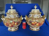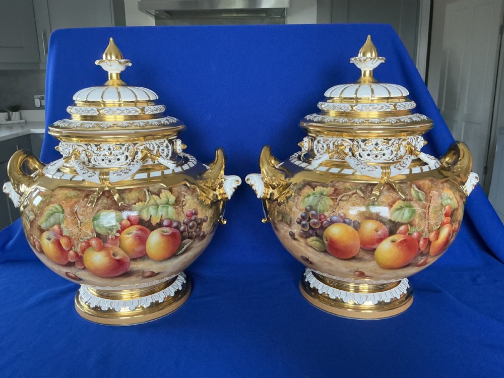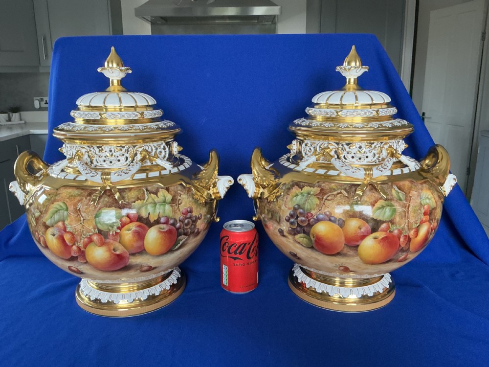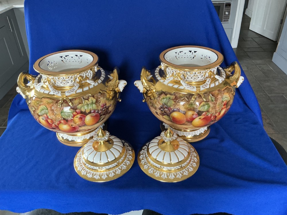 A superb pair of Royal Worcester painted fruit XL Jumbo size Bow vases and covers decorated all round by Paul English.