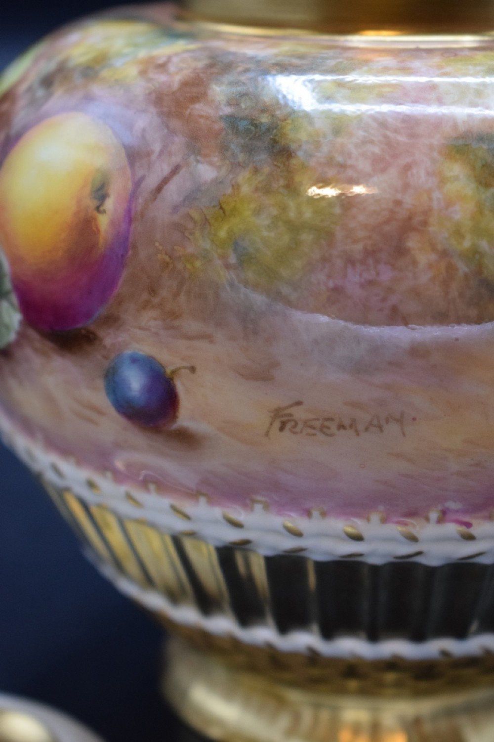 A good Royal Worcester painted fruit 3 piece pot pourri vase decorated all round by Freeman.