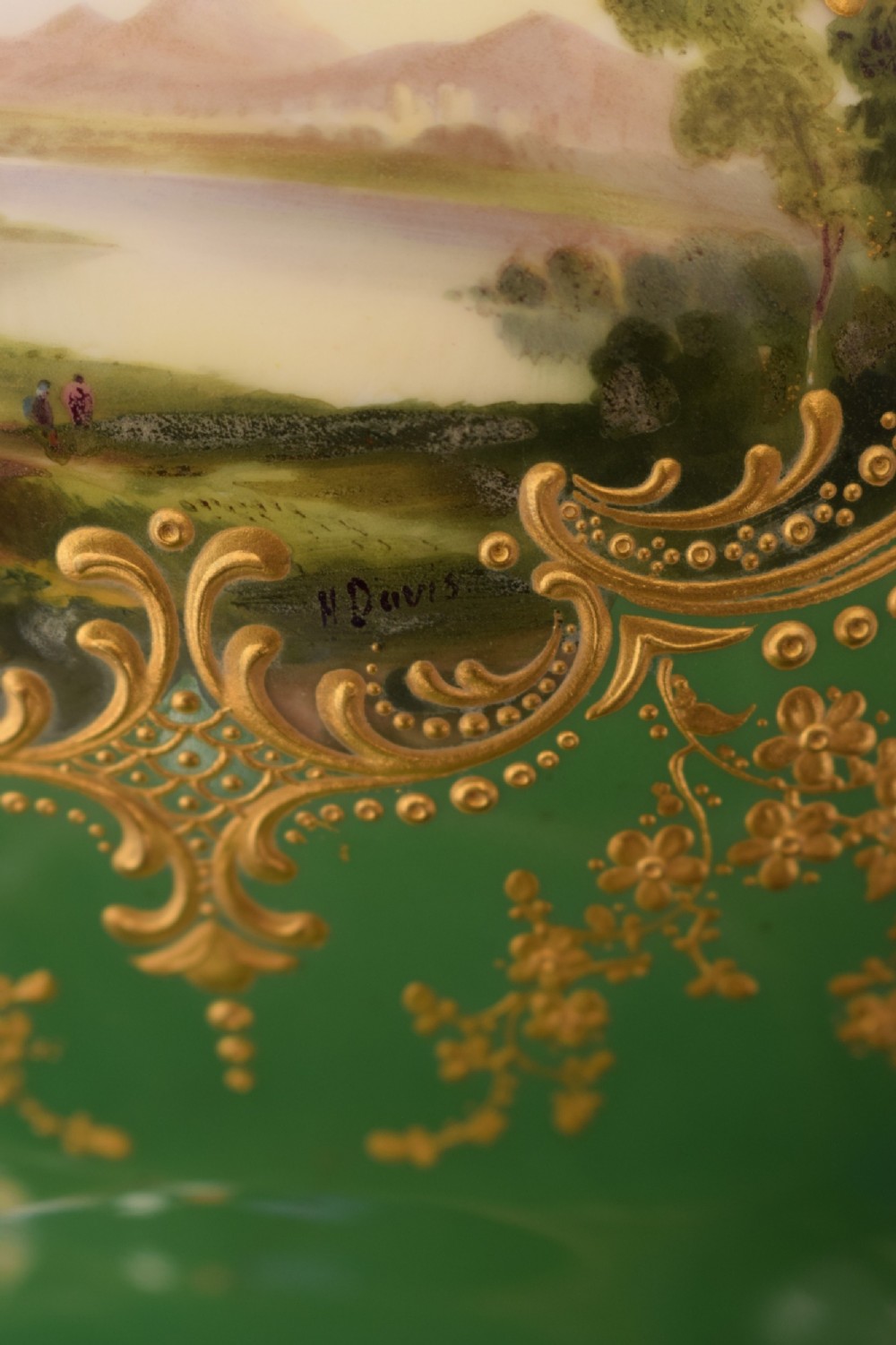 A Royal Worcester large pot pourri vase and cover decorated with a landscape panel by Harry Davis. An early Factory marked example of Davis's work, the pot pourri stands app. 12" (30cm) tall. Some minor gilt wear to rim and cover but overall an impressive large and inexpensive Davis pot pourri. Signed H Davis.